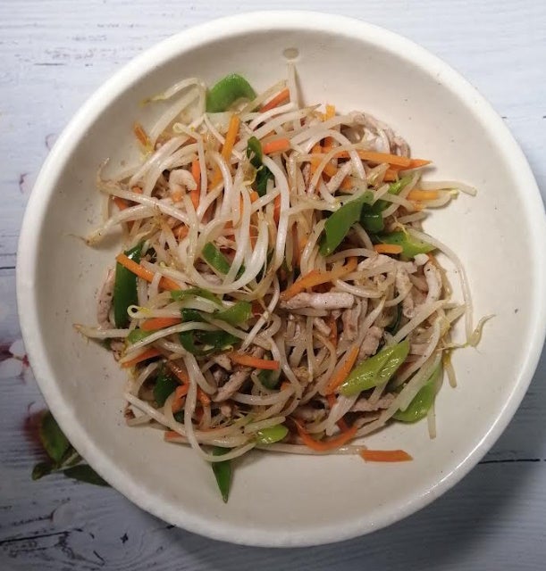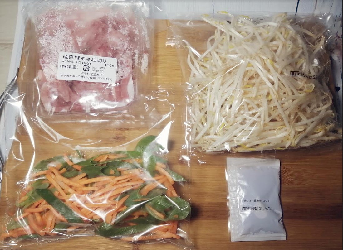 内容:産直豚モモの細切り200g・もやし200g・刻んだねぎと人参65g・だし20g